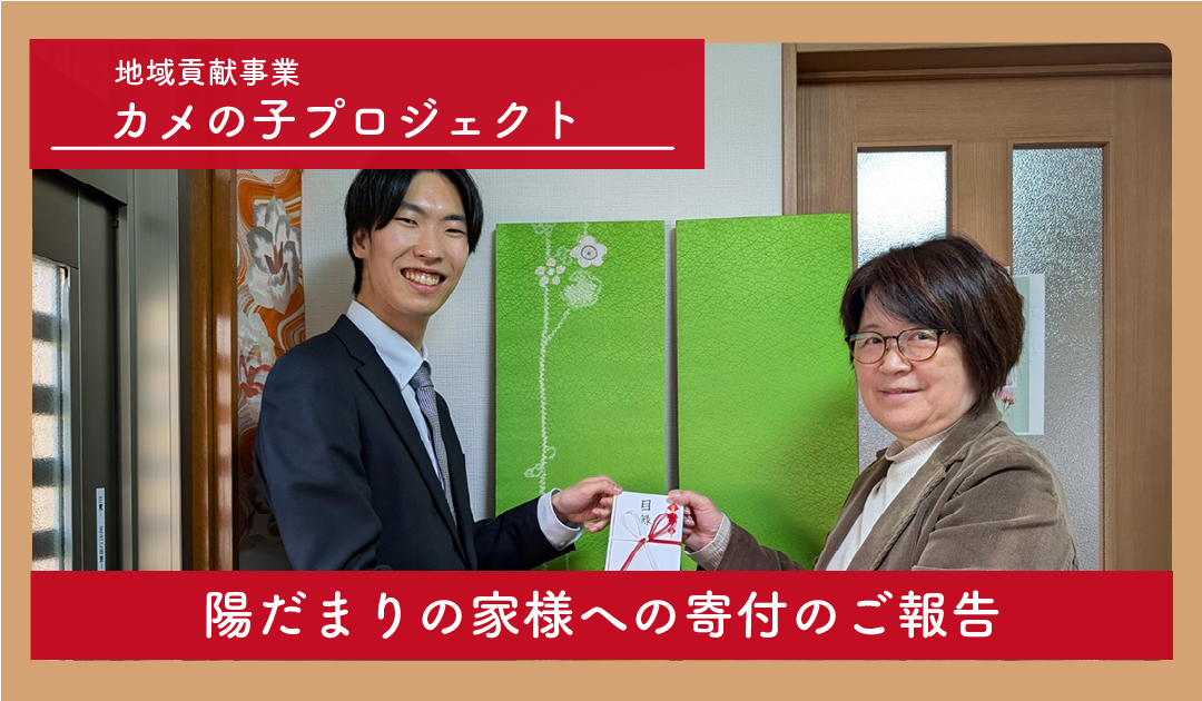 今回は、地域貢献事業【カメの子PJT】の一環として、特定非営利活動法人 陽だまりの家様へ寄付を行いました。