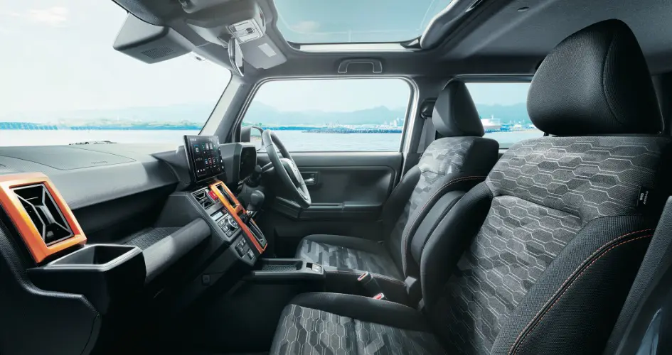 タフトの室内は、軽自動車とは思えない広さと機能性を備えています。最大の特徴は、全グレードに標準装備される大型のガラス屋根「スカイフィールトップ」です。頭上が開放的で、明るく快適な空間になっています。